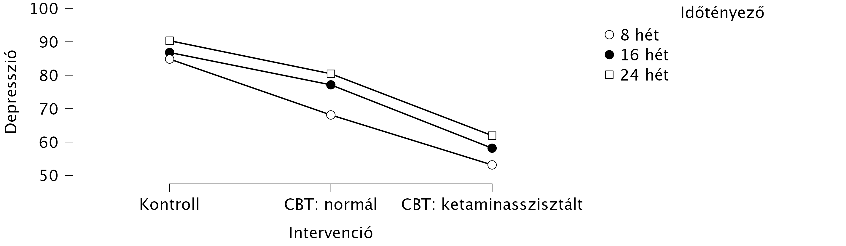 A terápiás módozat mint független szempont szerinti főhatás statisztikailag szignifikáns nagy hatásnagysággal: F(2, 117) = 17,985, p < 0,001, ω2p = 0,221. A modellünk varianciájának 22%-át magyarázza a terápiás módozat. A Scheffé-korrigált post-hoc vizsgálat alapján az egyszerű CBT intervencióban részesülők és a kontrollcsoport között nem volt statisztikailag szignifikáns különbség: t(117) = 2,440, pscheffe = 0,055, d = 0,457. Nagy hatásnagyságú, szignifikáns különbség volt a kontrollcsoport és a ketaminasszisztált CBT csoport depressziópontszámaiban az utókövetés során: t(117) = 5,965, pscheffe < 0,001, d = 1,118. Az egyszerű és ketaminasszisztált kognitív viselkedésterápia között is szignifikáns, közepes hatásnagyságú különbséget találtunk: t(117) = 3,524, pscheffe = 0,003, d = 0,660.