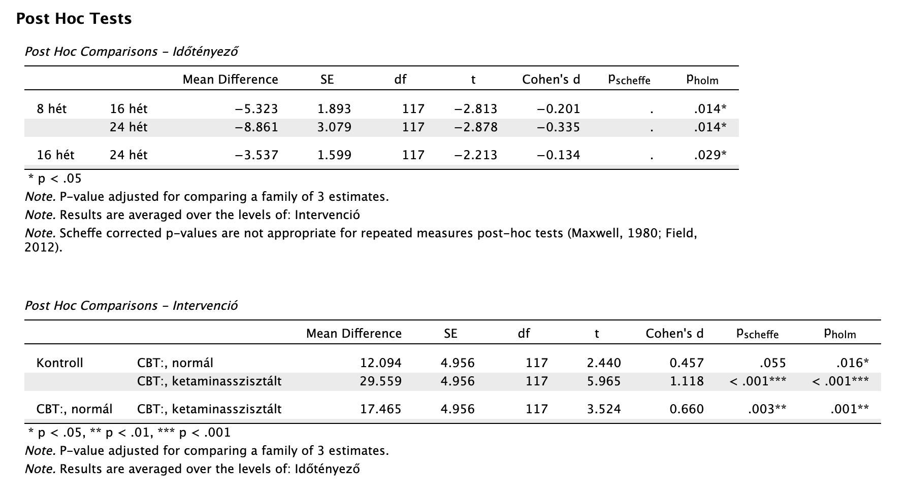 Ahogy minden többszempontos vizsgálatnál, itt is az interakciót olvassuk le először. Láthatjuk, hogy a hatás nem szignifikáns (p = 0,629 > 0,05). Tehát az időtényező és a terápiás módozat hatása nem egymás szintjétől függ. Tehát a főhatásokat önállóan vizsgáljuk, és post-hoc tesztet végzünk Holm korrekcióval az összefüggő szempontra, Scheffé korrekcióval a független szempontra.