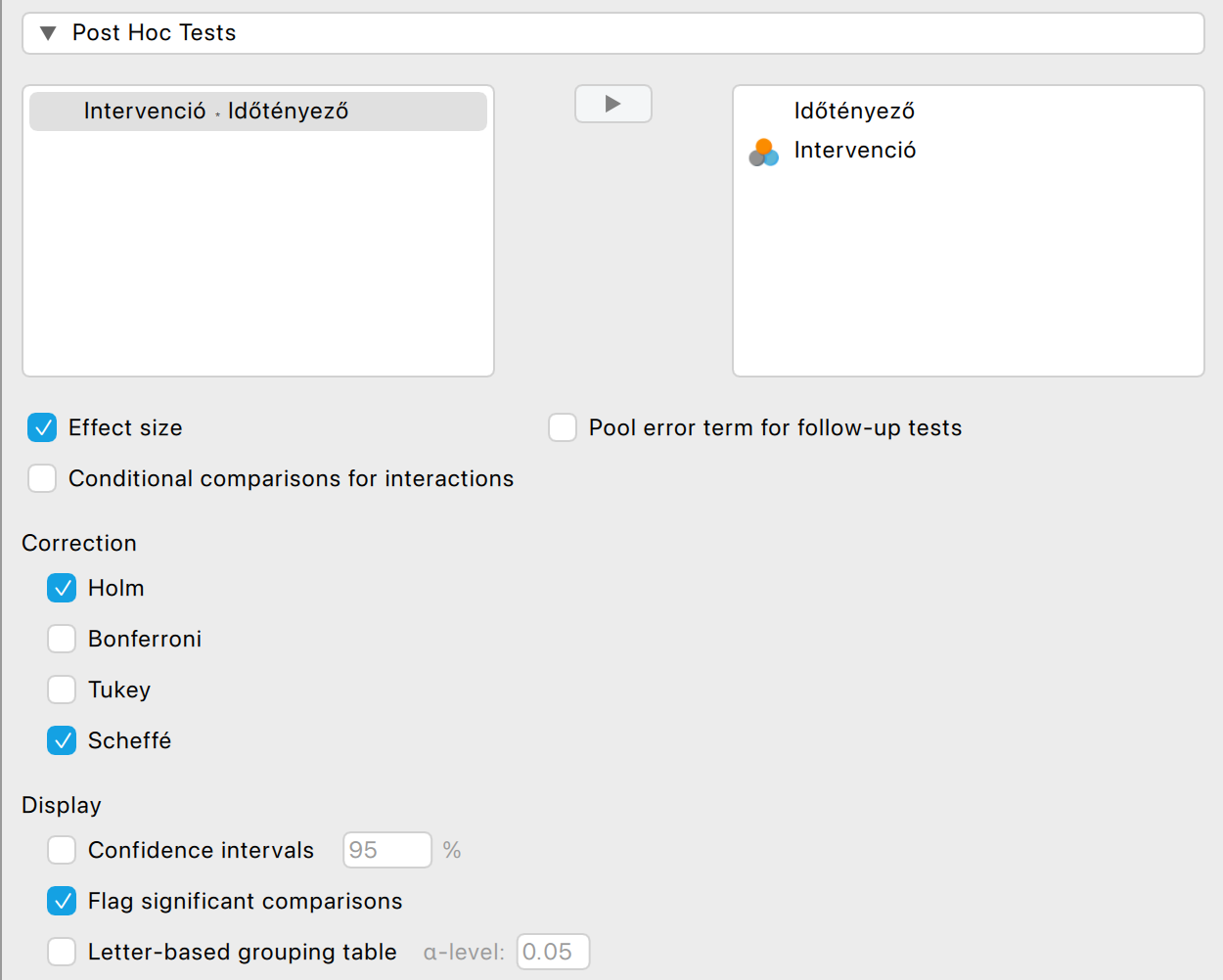 Mivel ordinális interakcióról van szó, végezhetünk ugyan post-hoc tesztet, de óvatosan értelmezzük, és ki kell egészítsük Simple Main Effects elemzéssel.
