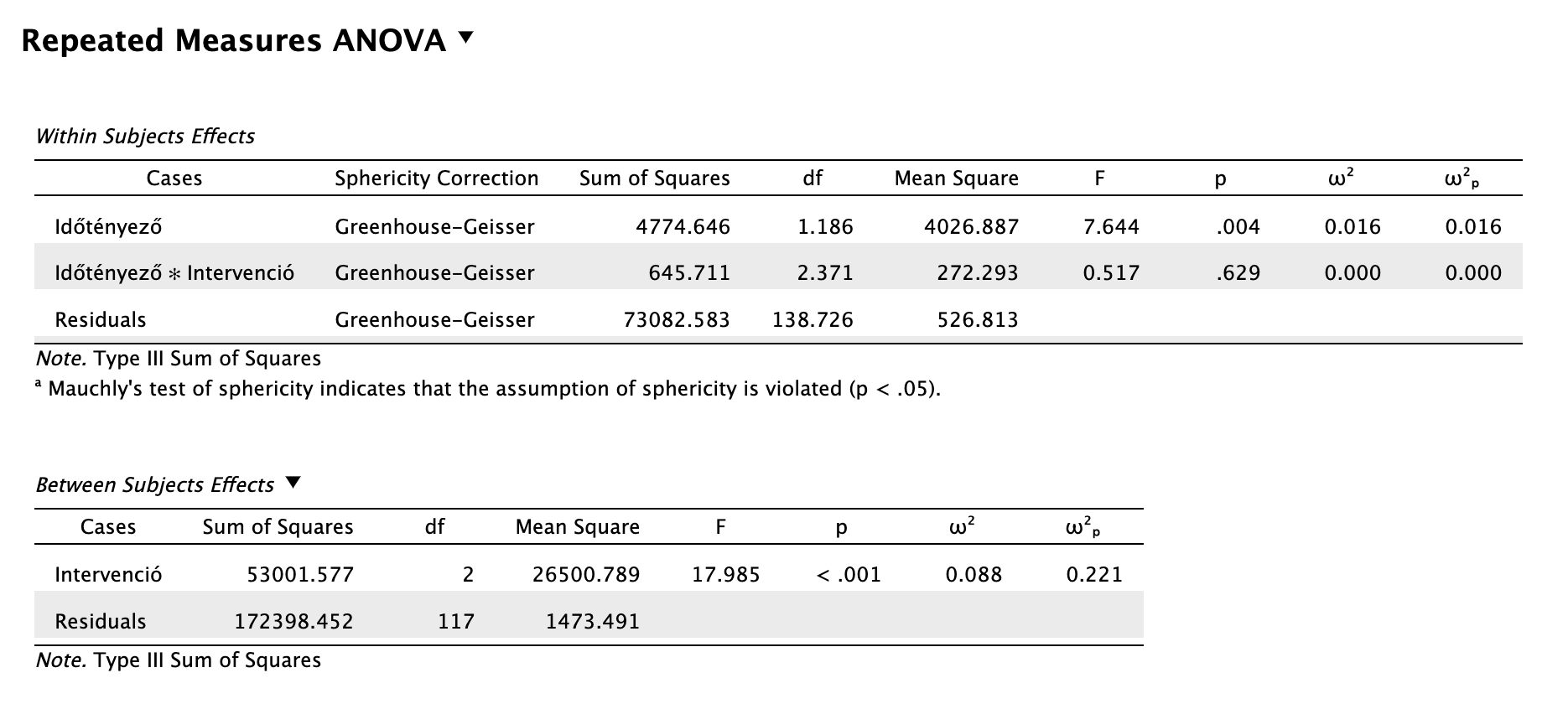Az összefüggő szempont (ismételt mérések) szfericitását a Mauchly-próbával ellenőrizzük. Láthatjuk, hogy a próba szignifikáns, tehát a szfericitás feltétele sérül. Emiatt meg kell vizsgálnunk az ε értéket, és a megfelelő szfericitáskorrekciót alkalmazzuk: mivel a Greenhouse-Geisser ε < 0,75, ezért a Greenhouse-Geisser-korrekciót alkalmazzuk: