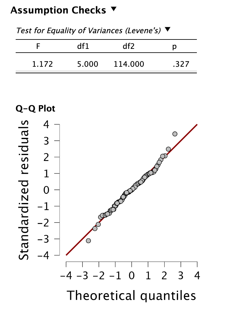 A minták illesztettek, a függetlenség nem sérül, a vizsgált változó skála típusú, a szóráshomogenitás feltétele Levene-próba alapján fennáll (F(5, 114) = 0,738, p = 0,596), a maradványértékek normalitása nem sérül (W(120) = 0,986 p = 0,328).