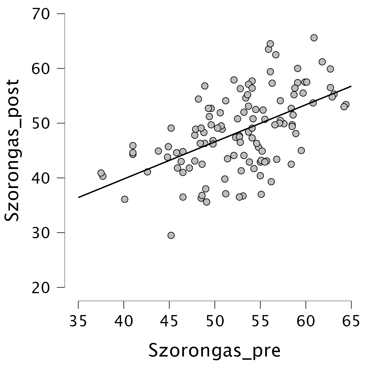 A kovariáló tényező skála típusú és kevés zajjal mér (vagy legalábbis ugyanannyi zajjal, mint a vizsgált változó, mert ugyanazt a kérdőívet vettük fel előtte és utána)
