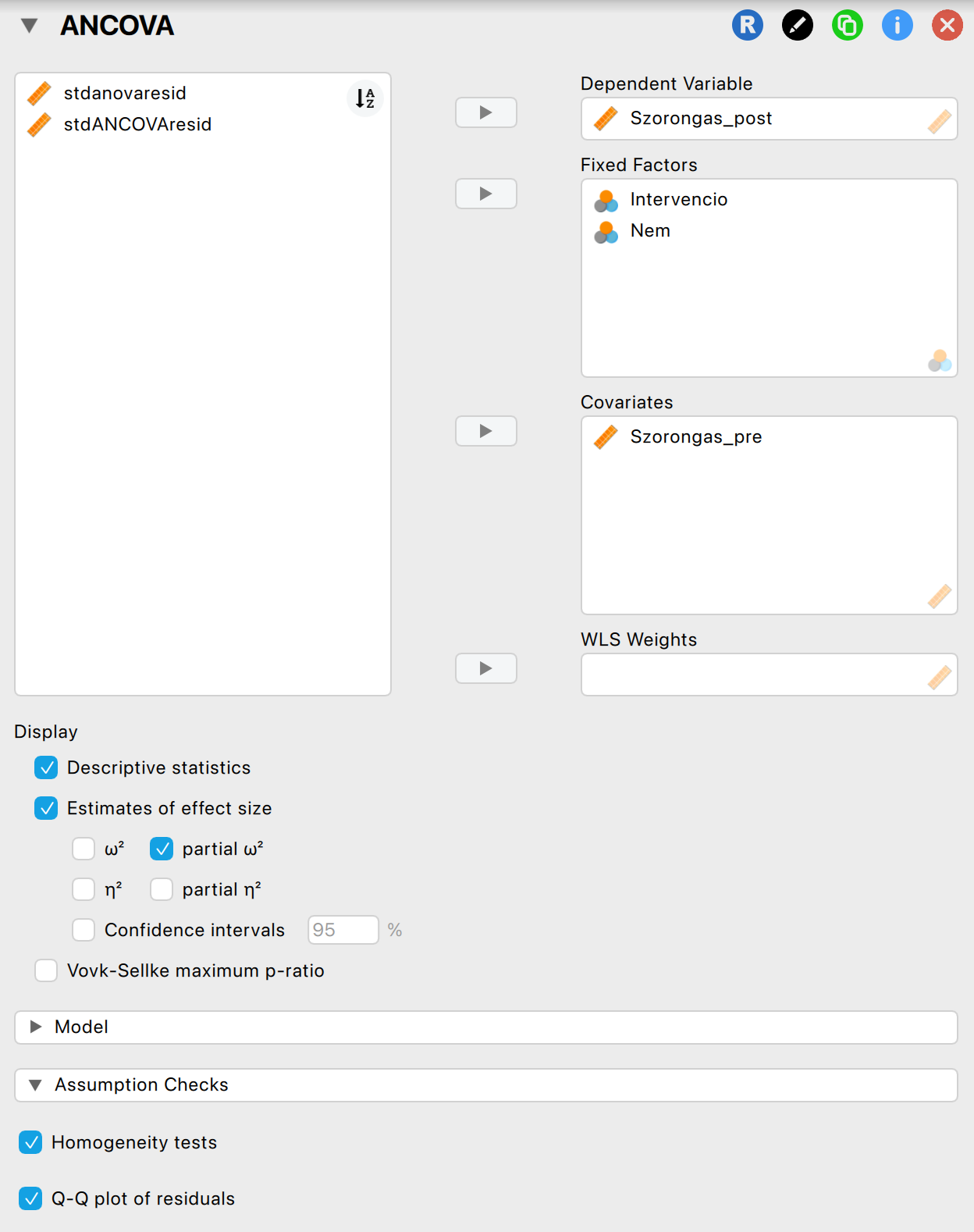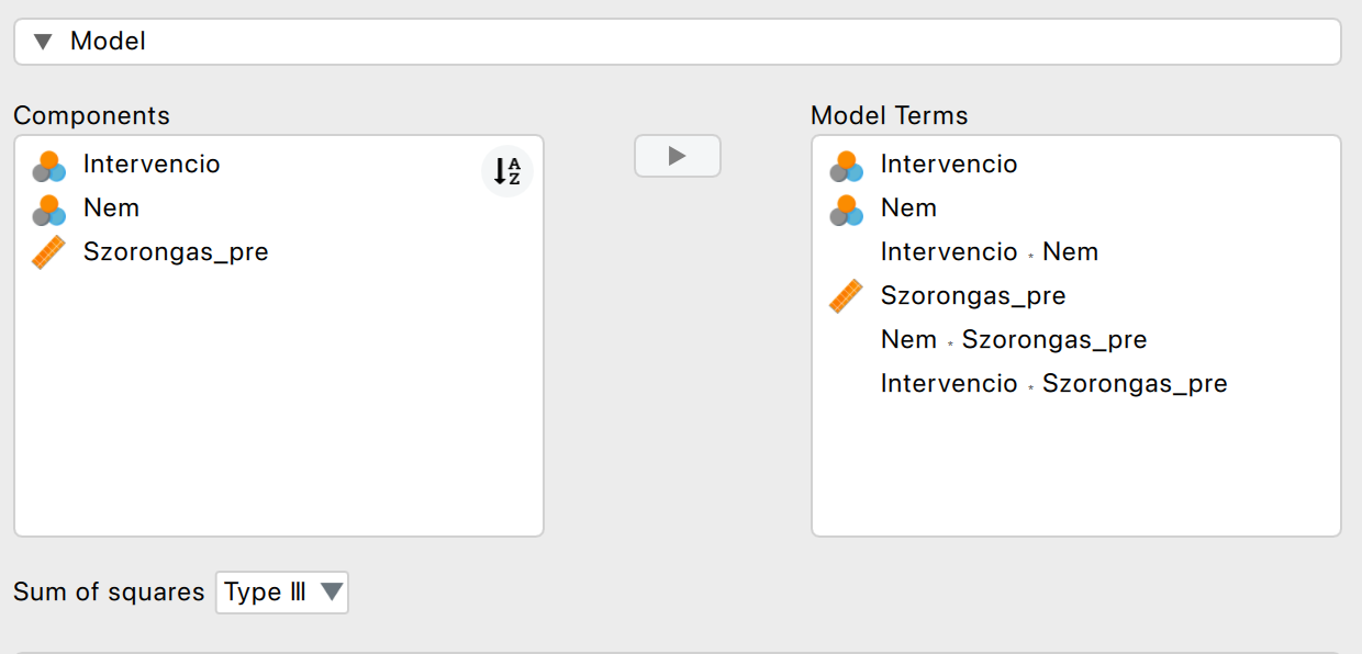 A kovariáló tényező regressziós meredekségének homogenitása a diszkrét változók minden szintjén: ehhez kézzel hozzáadtuk a Szorongas_pre és Nem változónkat (Ctr/Cmd billentyűk segítségével) és a Szorongas_pre és Intervencio változónkat a Model Terms rovathoz. Csupán ezeket az interakciókat olvassuk le, majd vegyük ki a változónkat a modellből, hogy ne zavarjon meg az értelmezésben.