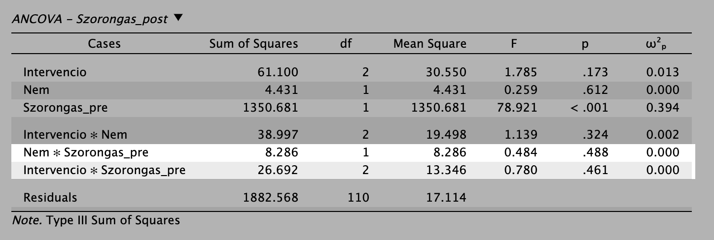 (Ha a diszkrét változó és a kovariáló tényező közötti interakció szignifikáns lenne, ezt a táblázatot egyáltalán nem értelmezhetnénk, mert az ANCOVA alapfeltétele sérülne.)