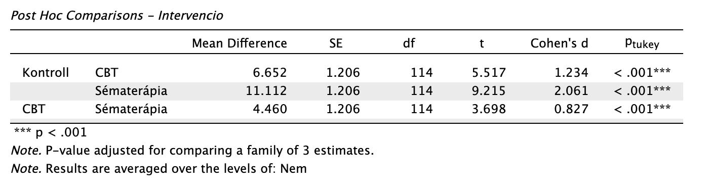 Az intervenció főhatása szignifikáns nagy hatásnagysággal: F(2,114) = 43,009, p < 0,001, ω2p = 0,412. Tukey-korrigált post-hoc teszt alapján láthatjuk, hogy minden módozatt között szignifikáns a különbség a nagy hatásnagysággal.