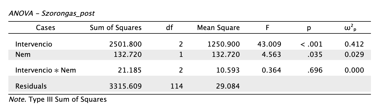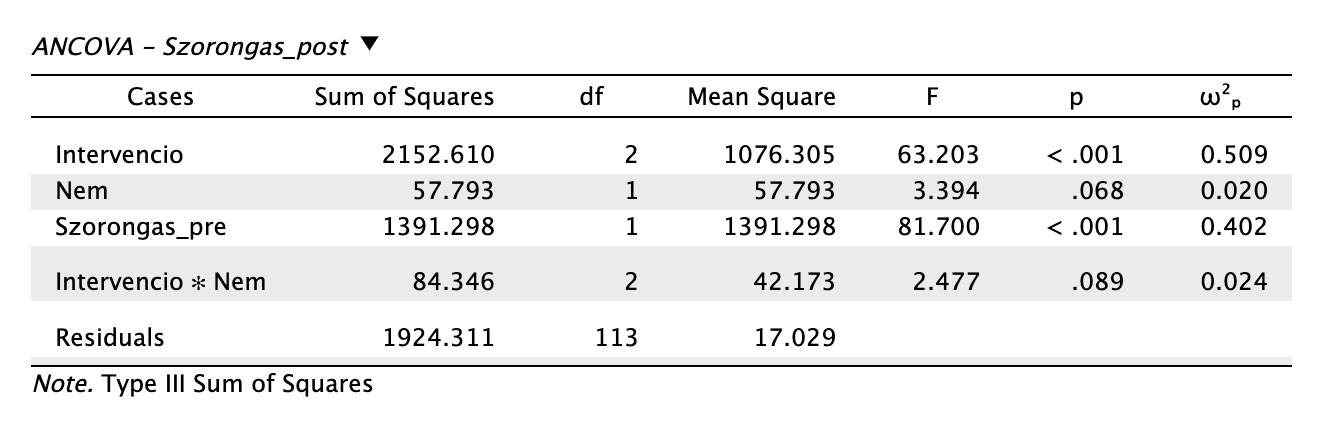 Az intervenció típusa mint főhatás szignifikáns nagy hatásnagysággal a kezdeti szorongás figyelembe vételével: F(2,113) = 63,203, p < 0,001, ω2p = 0,509. A nem főhatása ellenben nem szignifikáns, ha kontrollálunk a kezdeti szorongással: F(1,113) = 3,394, p = 0,068, ω2p = 0,020.