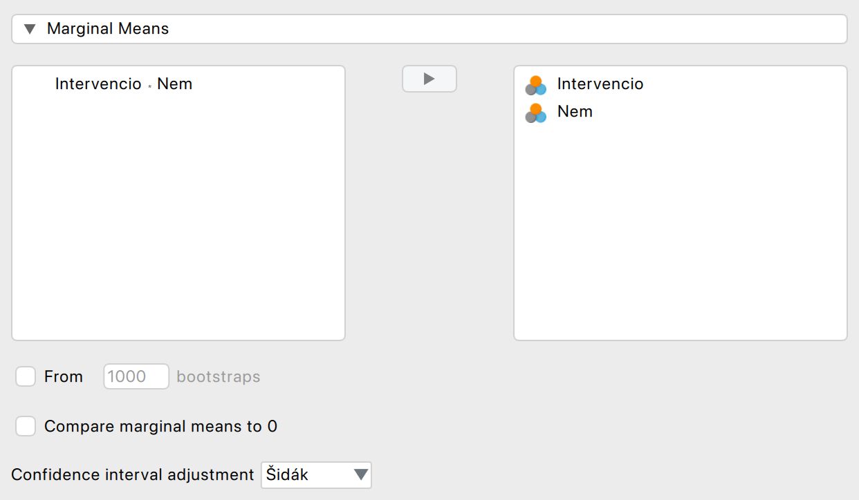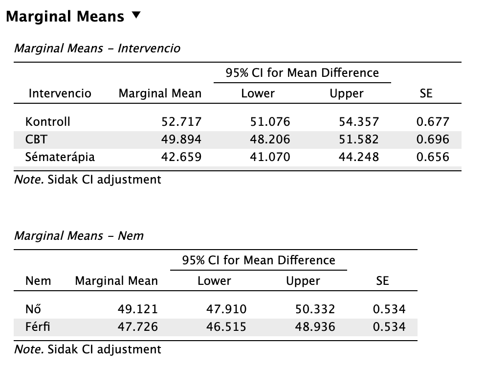 Ezt követően egy Marginal Means elemzést végzünk Šidák-korrekcióval (nem pedig Simple Main Effects vizsgálatot, sem pedig Post-hoc tesztet).