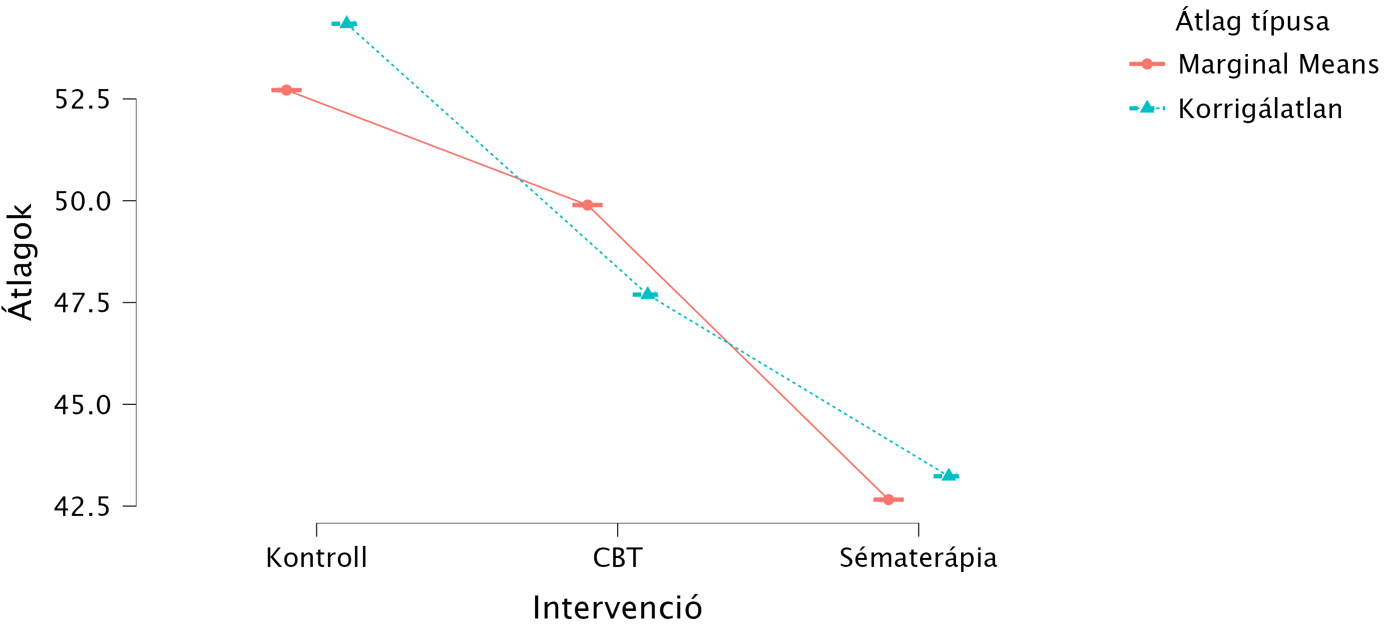Láthatjuk, hogy sorrendváltozás ugyan nem történt, de a különbségek „meredeksége” változott. A kontroll és CBT csoport közötti különbség (Δ MMM = 2,82) kisebb a becsült átlagok alapján, mint a nyersátlagok (Δ Mnyers = 6,65) alapján. Tehát a csoport kezdeti összetétele nem volt teljesen azonos szorongáspontszámot tekintve a két csoport között, így a kovariáló tényező figyelembe vétele nélkül a CBT hatékonysága felülreprezentált lett volna. Mindeközben a sématerápia esetén a becsült átlag a nyers átlagnál alacsonyabb (Δ MMM-nyers = -0,59), tehát hatékonyabbnak bizonyult figyelembe véve a kezdeti pontszámokat is.