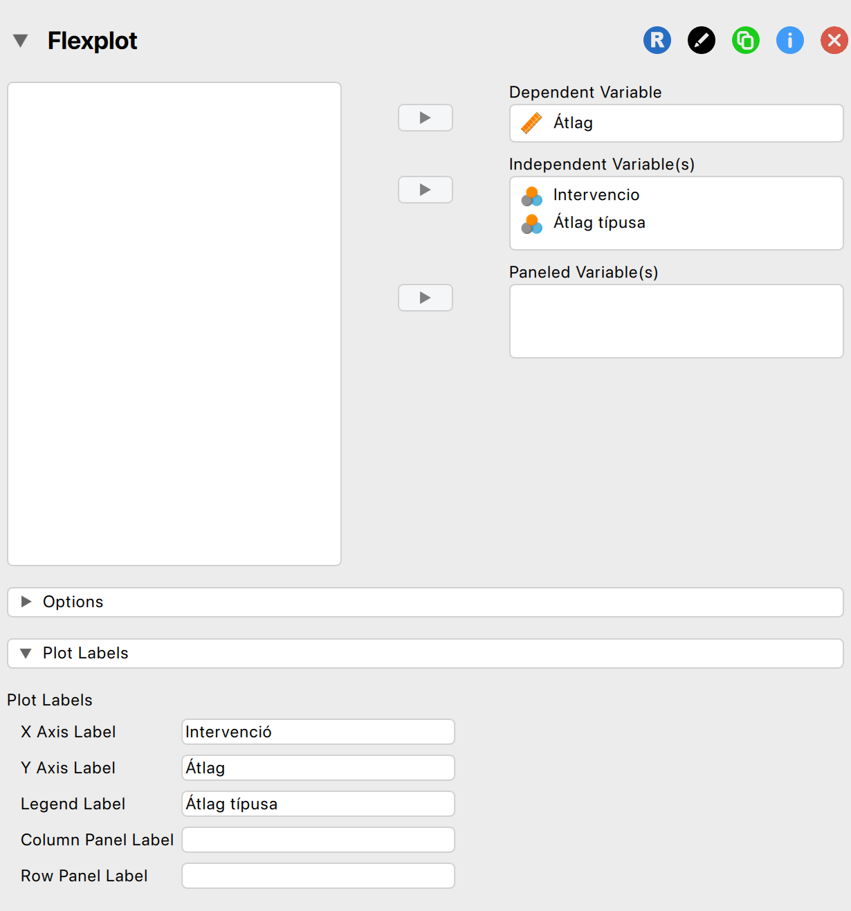 - A Model szekcióban kiválasztjuk a két változót (Ctrl vagy Cmd + kijelölés segítségével), aminek az interakcióját szeretnénk hozzáadni a modellhez