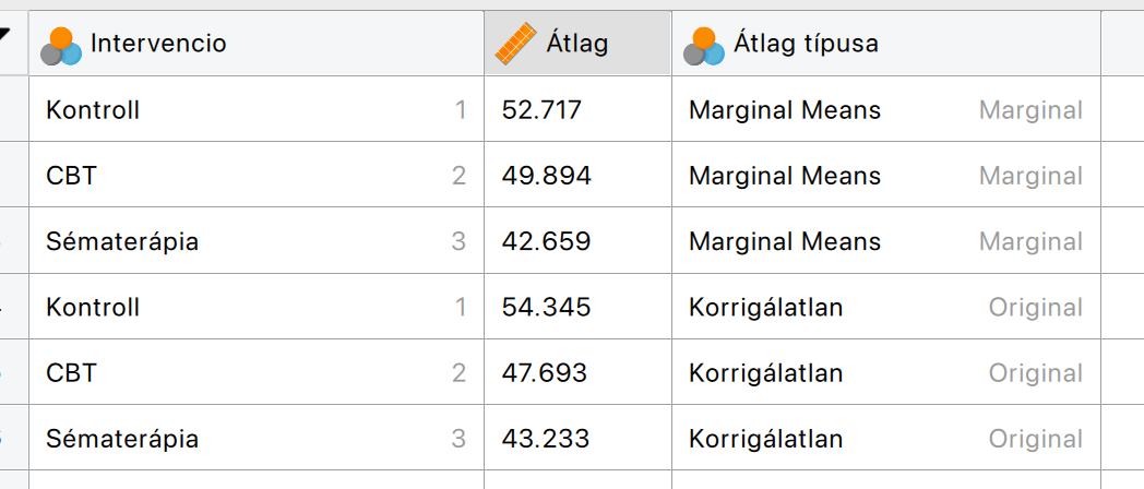 A szöveges elemzésünkben ezeket a korrigált átlagokat fogjuk jelenteni, nem pedig a nyers átlagokat mindegyik szempontban (függetlenül a szignifikanciától). Értelmezni viszont csak a szignifikáns szempontot (jelen esetben az intervenció típusát) fogjuk.