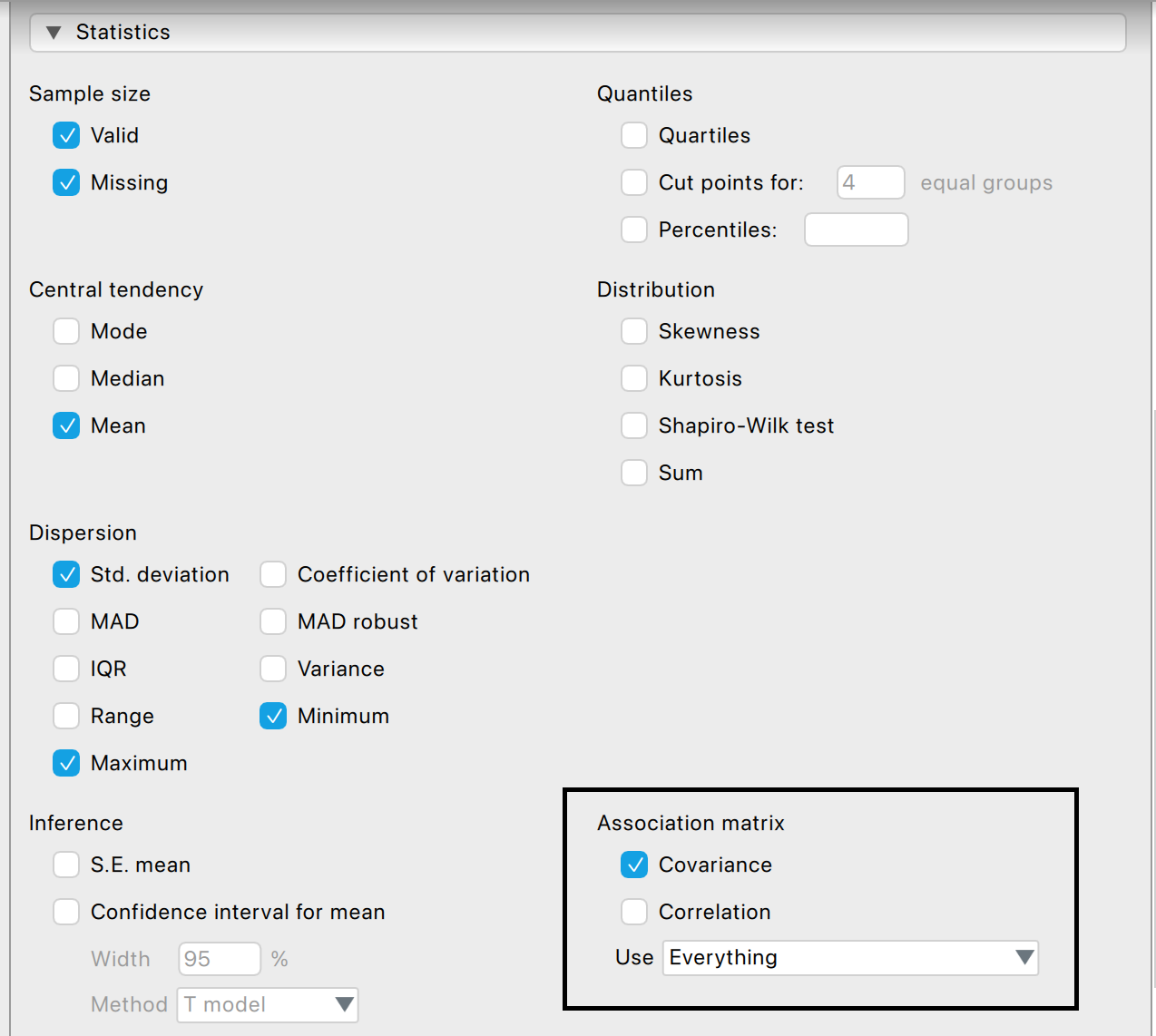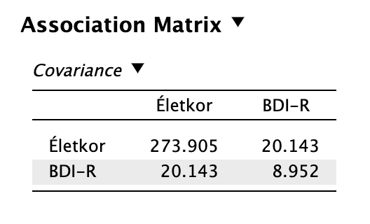 A kovarianciamátrixot a JASP leíró statisztika moduljában létre tudjuk hozni: