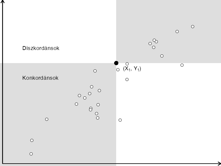 A fekete adatpont (x1, y1) konkordáns párjai a szürke háttérrel jelölt zónában lehetnek. Konkordáns pár az, ami az x1 és y1 koordináta mindkét eleménél nagyobb vagy mindkét eleménél kisebb.