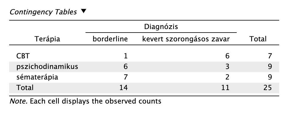 Példa 5.3 Vizsgáljuk meg, hogy van-e kapcsolat az alkalmazott terápiás módozatok (CBT, sématerápia, pszichodinamikus terápia) és aközött, hogy milyen pszichiátriai diagnózissal érkezett a páciens (borderline, kevert szorongásos zavar). Mintánkban n = 25 fő szerepel.