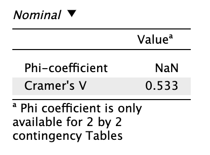 A kapcsolat nagyságát a Cramér-féle V kontingencia-együttható mutatja meg: 0,533.