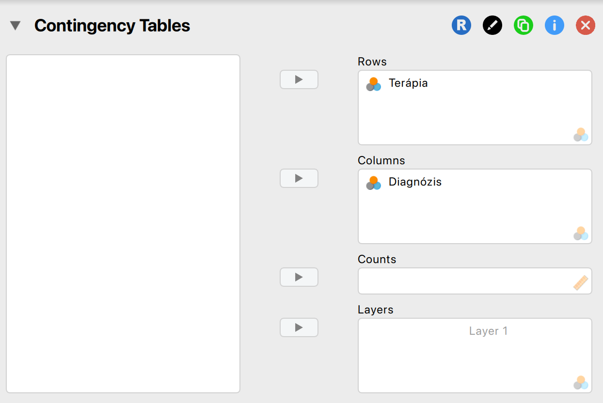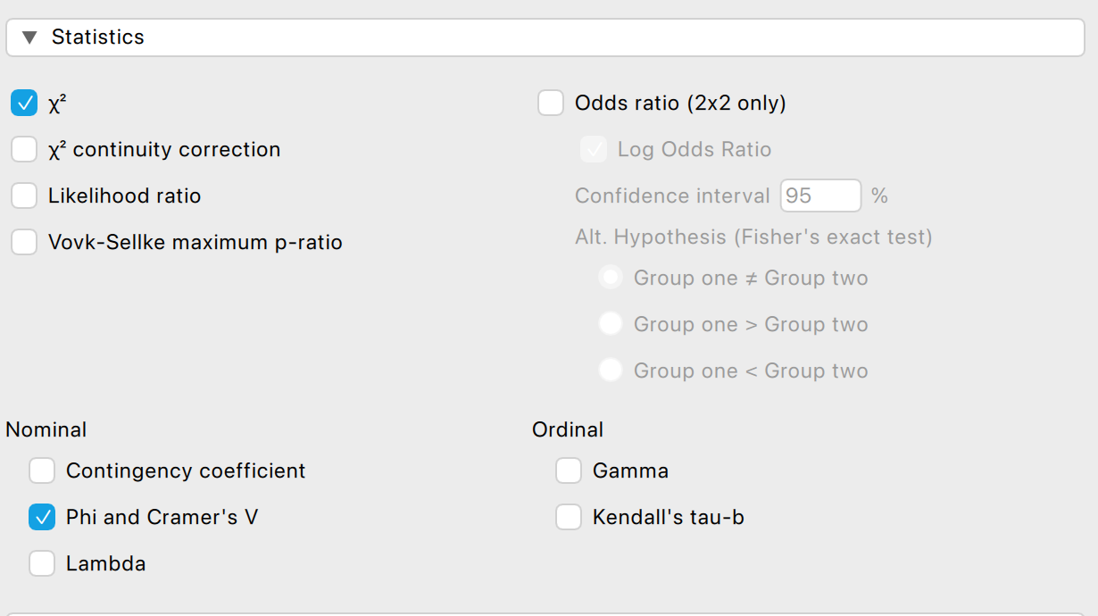 Nominális változókról lévén szó, kontingenciatáblát készítünk a JASP-ban.