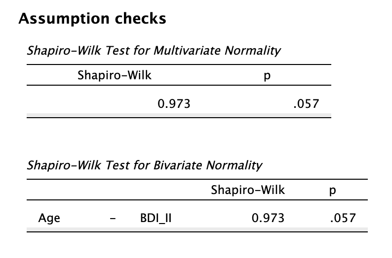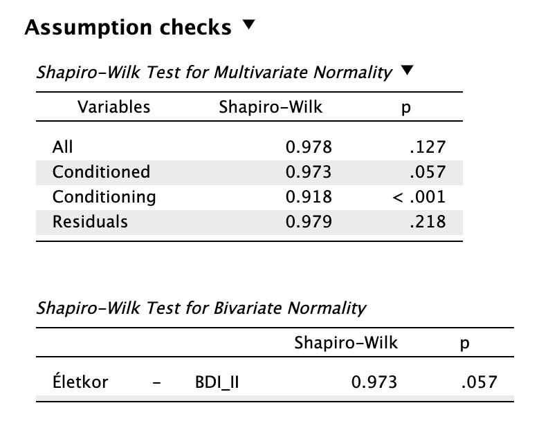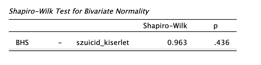 Példánkban csak két változót vizsgálunk, tehát a páronkénti (kétdimenziós) normalitásvizsgálat és a többdimenziós normalitás eredménye egybeesik. Az eredmény nem szignifikáns, mert \(p = 0{,}057 > 0{,}05\).