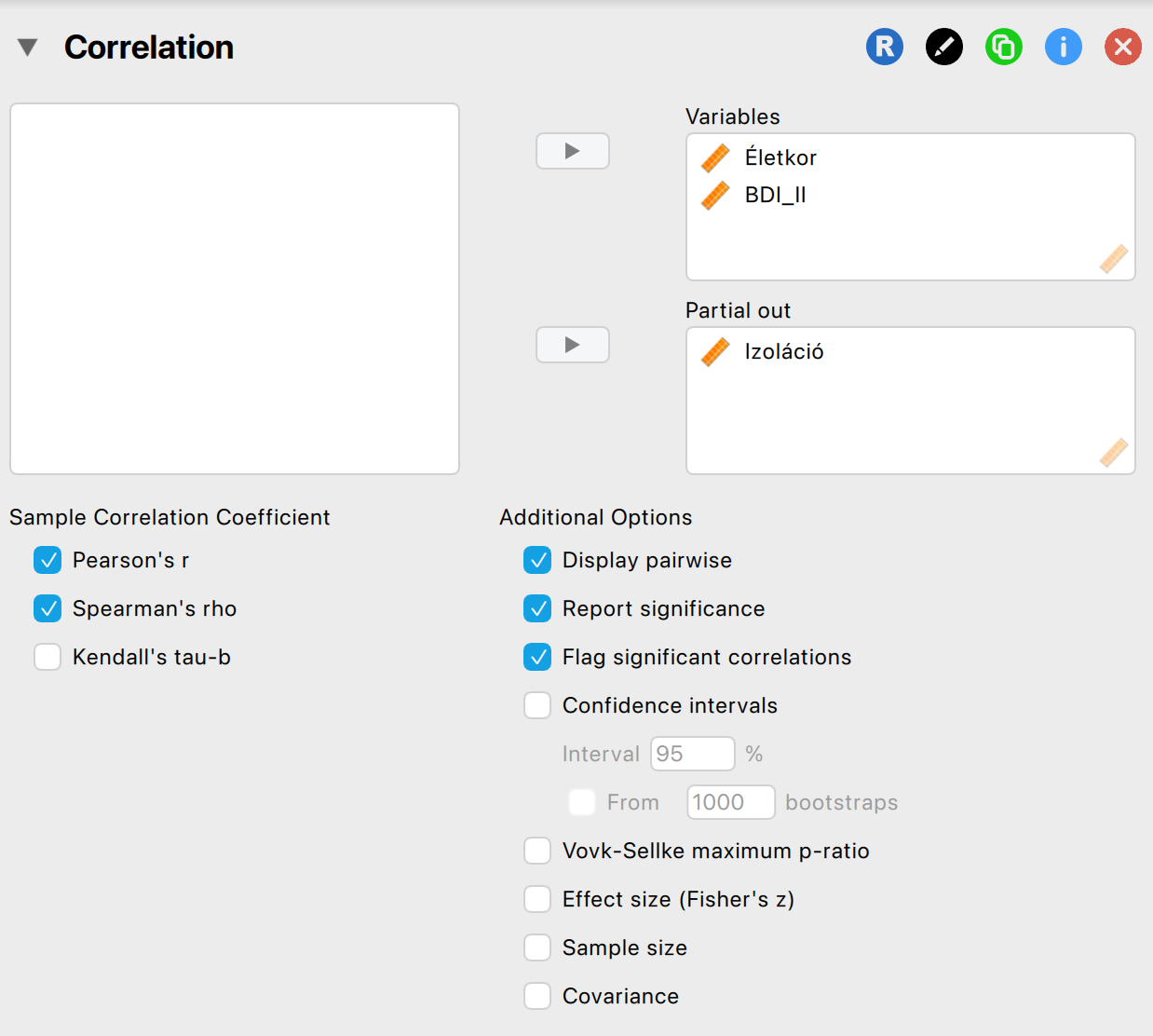A parciáliskorreláció-vizsgálatok esetén is fontos a normalitásvizsgálat. A JASP-ban ugyanabban a modulban érjük el a parciáliskorreláció-vizsgálatot, mint a korrelációs vizsgálatot, csak ez esetben a Partial out rovatba húzzuk a kontrollváltozónkat.