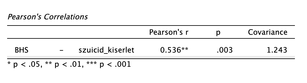 Megoldás 5.4. Pont-biszeriális korrelációs analízist végeztünk annak feltárására, hogy van-e összefüggés a szuicid kísérletek és a Beck-féle Reménytelenség Skálán (BHS) elért pontszámok között. Statisztikailag szignifikáns, közepes-erős pozitív kapcsolatot találtunk a két változó között: rpb(26) = 0,536, p = 0,003. Az eredmények értelmében a magasabb reménytelenség-pontszám szignifikánsan együtt jár a szuicid kísérlet előfordulásával.