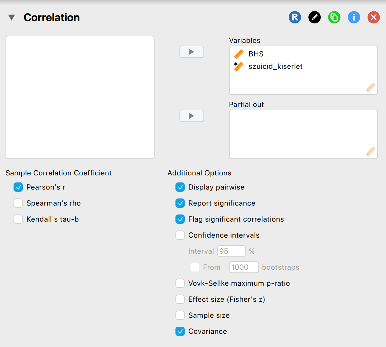 A JASP-ban elég megtévesztő módon ugyanúgy a korrelációs modulban érthető el, és a dichotóm változót (hiába van nominálisként kódolva) ugyanúgy a változók közé kell behúzni. A JASP pszeudo-skálává alakítja (kis csillag jelenik meg a vonalzó ikon mellett). A Pearson-féle együtthatót kell kipipálni továbbra is, de ne tévesszen meg minket, valójában a pont-biszeriális együtthatót számolja ki a szoftver. YouTube útmutató