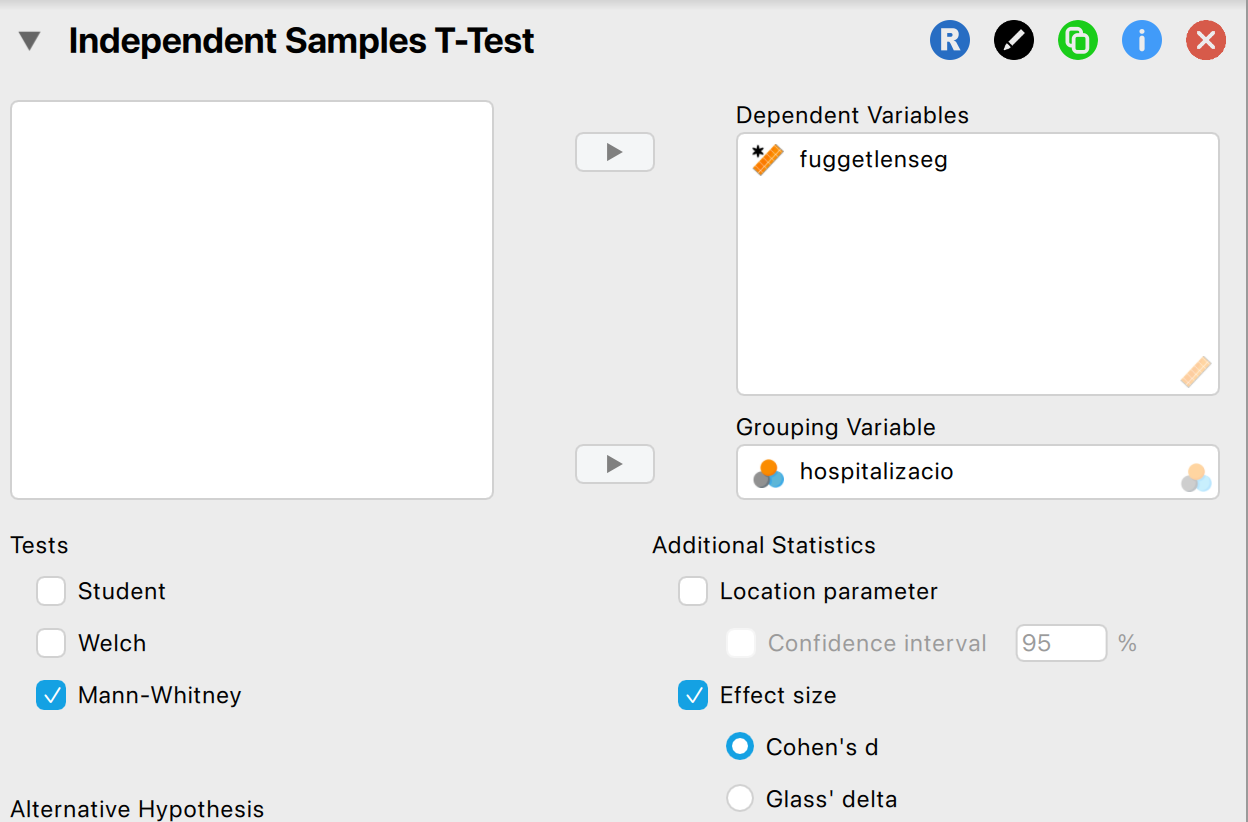 A rang-biszeriális korrelációhoz kicsit körmönfontan lehet hozzájutni a JASP-ban. A függetlenmintás t-próba modult kell kiválasztani, majd a dichotóm változót a csoportosító változóhoz kell behúzni, míg az ordinális változót a függő változóhoz (ne ijedjünk meg itt sem, pszeudo-skálára alakítja a JASP a változónkat). Fontos, hogy a Mann-Whitney-féle U-próbát válasszuk ki és jelöljük be a hatásnagyságot is! Az alábbi ábra szemlélteti a helyes beállítást: