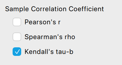 A Kedall-tau érték kiszámítását ugyanazon a panelen kérhetjük a JASP-tól, ahol a Pearson vagy Spearman korrelációs együtthatókat kértük.
