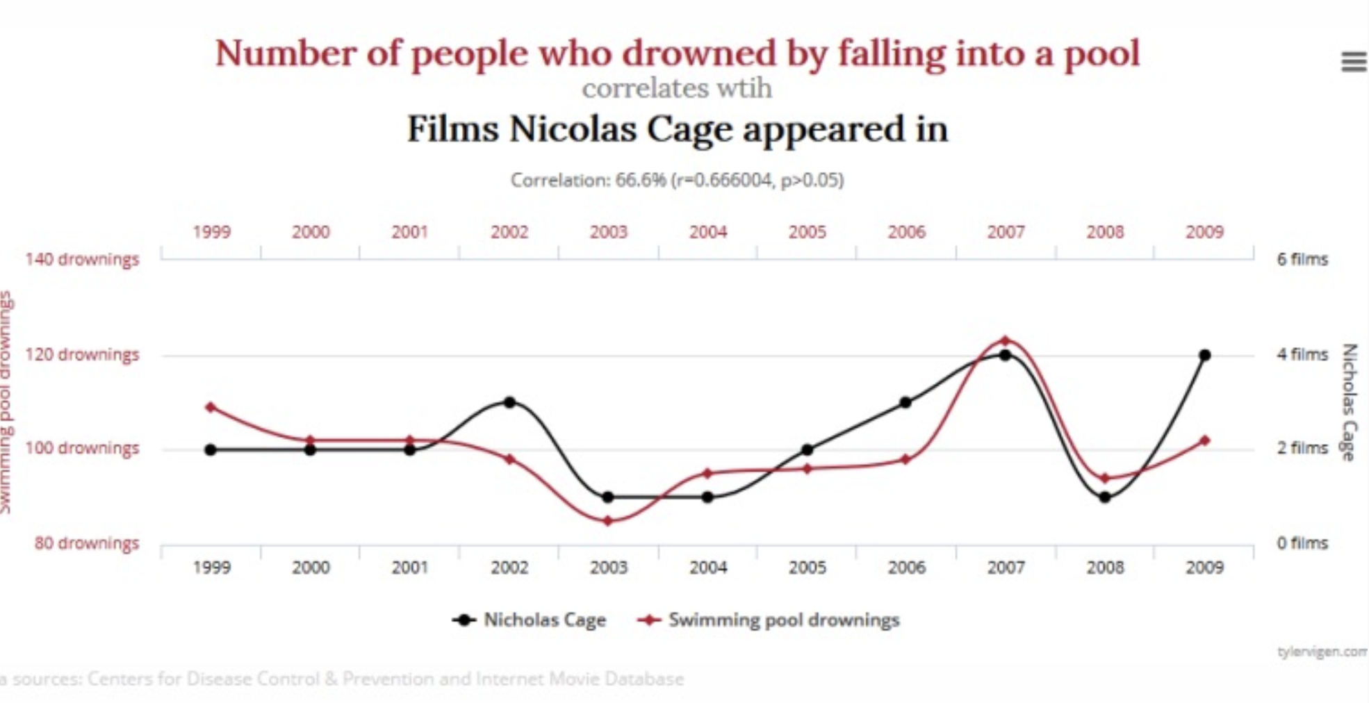 Az együttjárás viszont nem jelent ok-okozati kapcsolatot! Íme egy (ugyan nem szignifikáns, de közepes-erős) korreláció a Nicolas Cage filmdebut-k és medencébefúlás között: