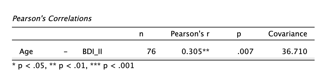 Megoldás 5.2. Az életkor és depresszió pontszámok közötti együttjárás megállapítására korrelációs vizsgálatot végeztünk. Az adatok páronként normál eloszlást követnek (W(76) = 0,973, p = 0,057), ezért Pearson-féle korrelációs együtthatót számítottuk ki. A próba statisztikailag szignifikáns és közepes mértékű együttjárást mutat az életkor és a BDI-vel mért depresszió konstruktuma között: r = 0,305, p = 0,007.