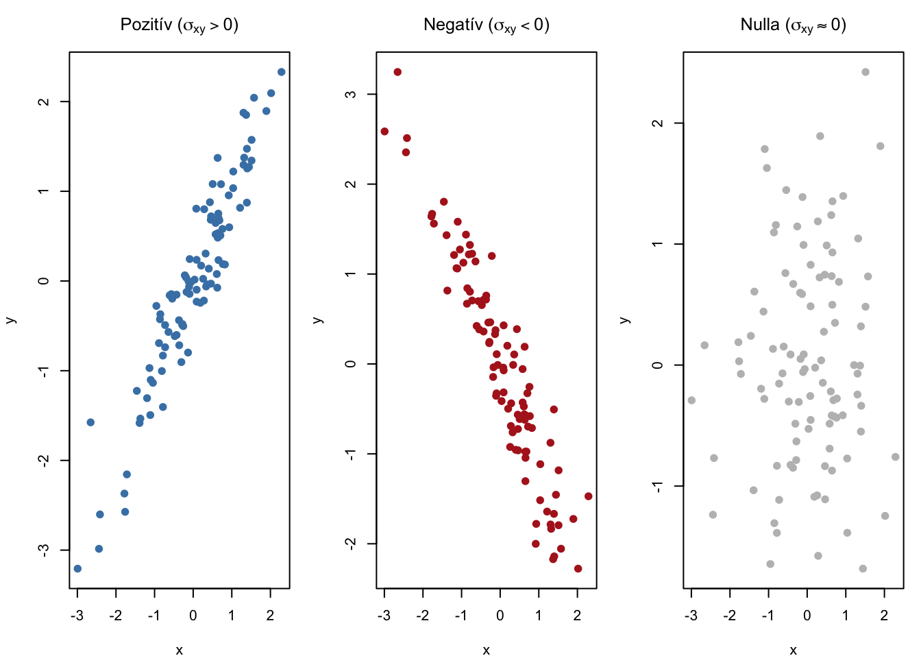 A kovariancia nulla, ha az eltérésszorzatok (\((x_i - \bar{x})(y_i - \bar{y})\)) összege kiegyenlíti egymást. Ha nem nulla, az előjele mutatja meg a kapcsolat irányát.