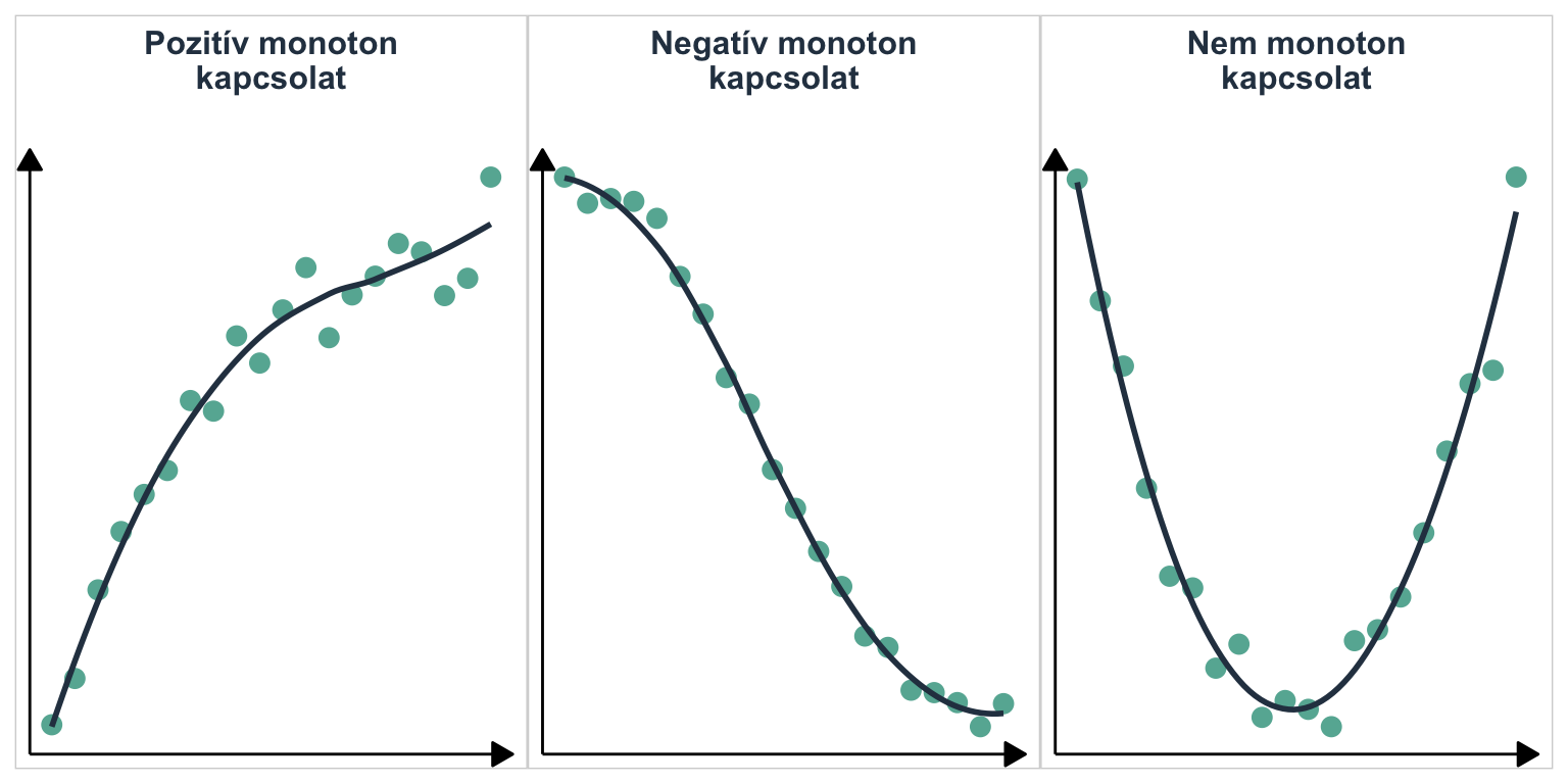 - A változók közötti kapcsolat nem kell lineáris legyen, de legalább monoton kell legyen.