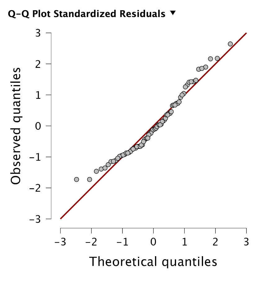 Egyszeres lineáris regresszió esetén szerencsére nem sok előfeltételt kell vizsgálnunk. Az egyetlen lényeges elem, hogy a kapcsolat lineáris legyen! Ezt ellenőrizni tudjuk, ha a maradványok lineáris alakot követnek. Ezt egy Q-Q ploton tudjuk ellenőrizni:
