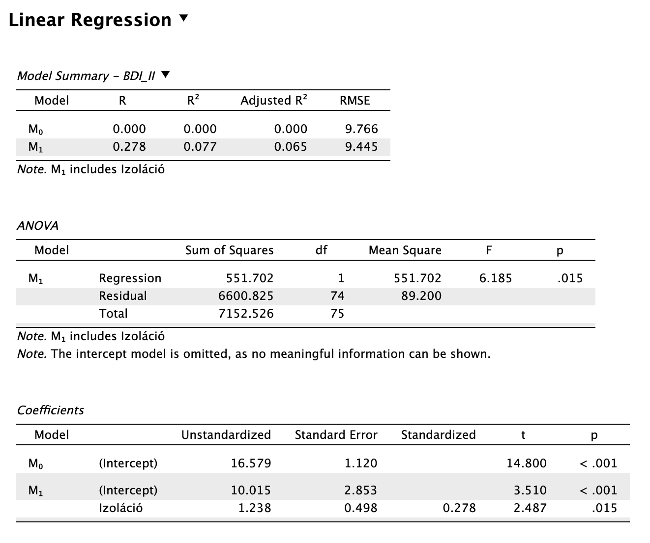 A nemsztenderdizált együttható alapján az izoláció pontszámának minden egyes egységnyi növekedése a depresszió pontszám 1,238 egységnyi emelkedésével jár együtt (b = 1,238, SE = 0,498). A modell konstans értéke 10,015 volt (p < 0,001).