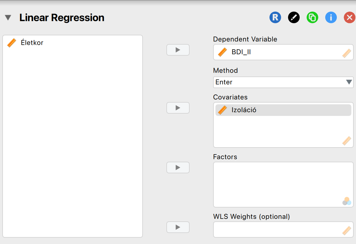 A Lineáris Regresszió modulban helyezzük el a függő és független változókat a megfelelő rovatokban: