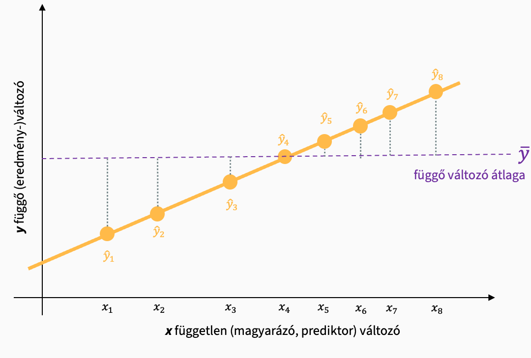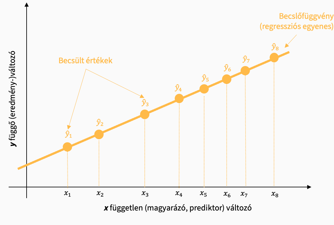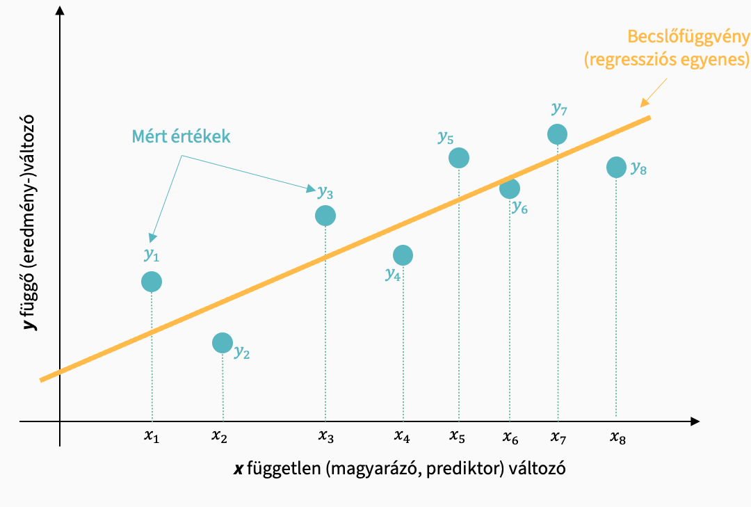 A regressziós modellünk az yi mért értékek alapján egy becslést hoz létre, amivel az y értékek bejósolhatók az x függvényében. Ezt a becslést a minta mért értékeire alapozza.