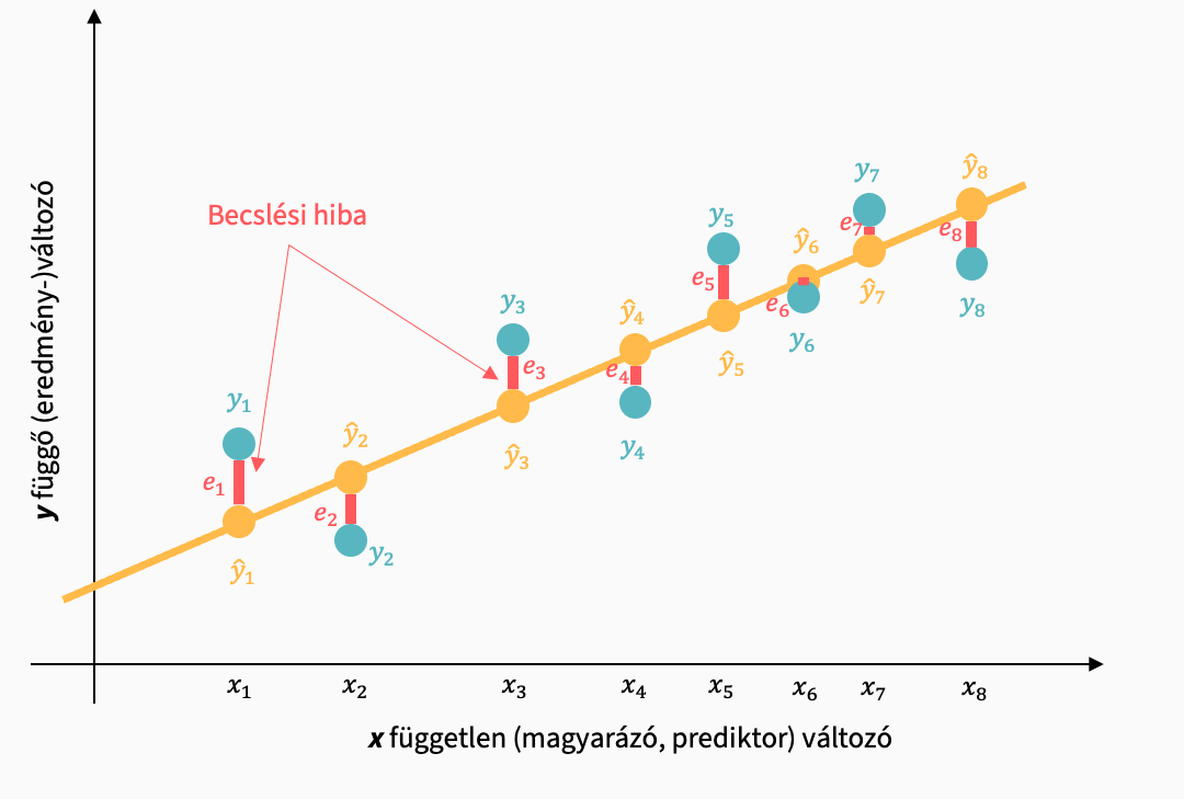 - e: a hiba a ténylegesen mért értékek és a regressziós egyenes pontjai (becsült értékek) között