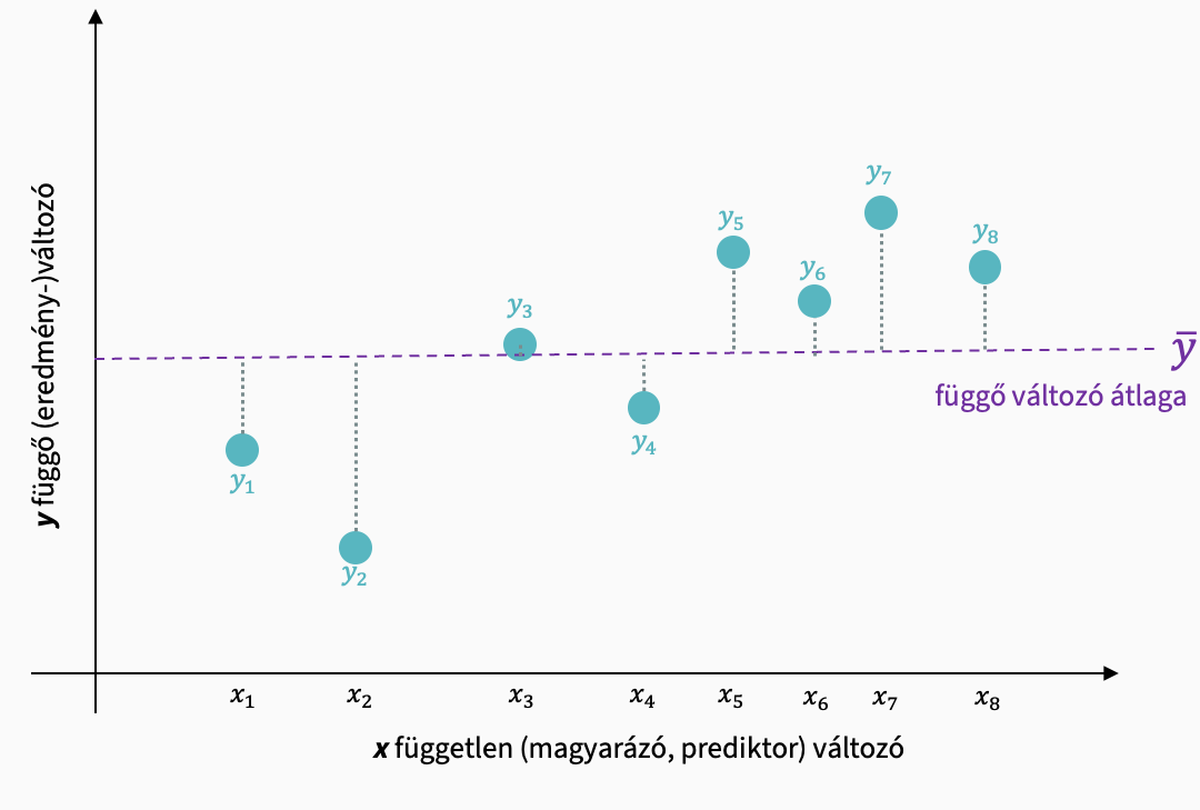 Regressziós modellünk az xi pontokhoz \(\hat{y}_i\) becsléseket rendel, amelyek a regressziós egyenesen helyezkednek el.